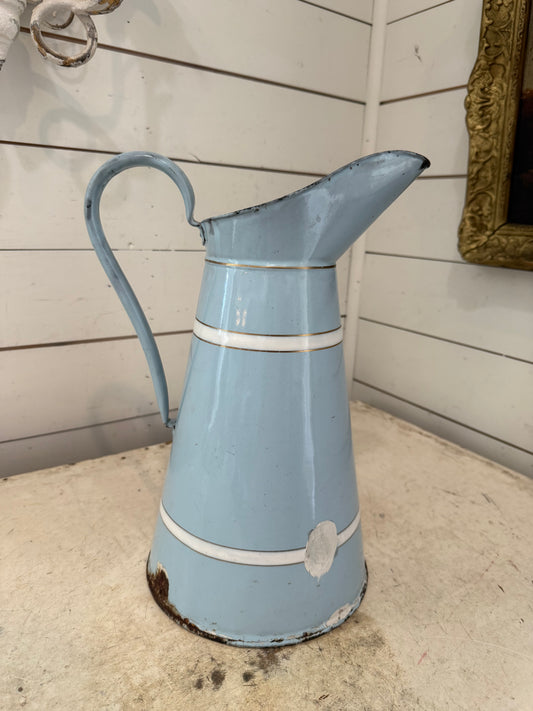 Vintage French pitcher jug decorated with baby blue & white enamel & gold lines, Vintage French enamel jug - chippy as is