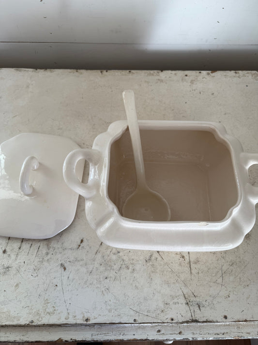 USA Pottery Cream Soup Tureen With Spoon - Has a chip
