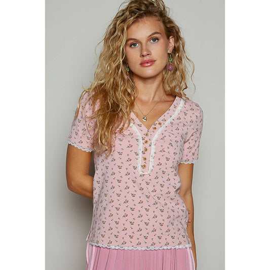V-neck short sleeve floral print knit top