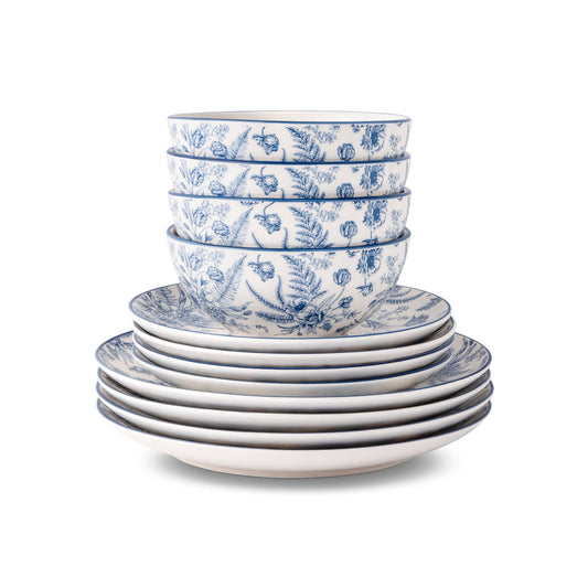 12pc Toile Dinnerware Set - Blue & White Plates and Bowls