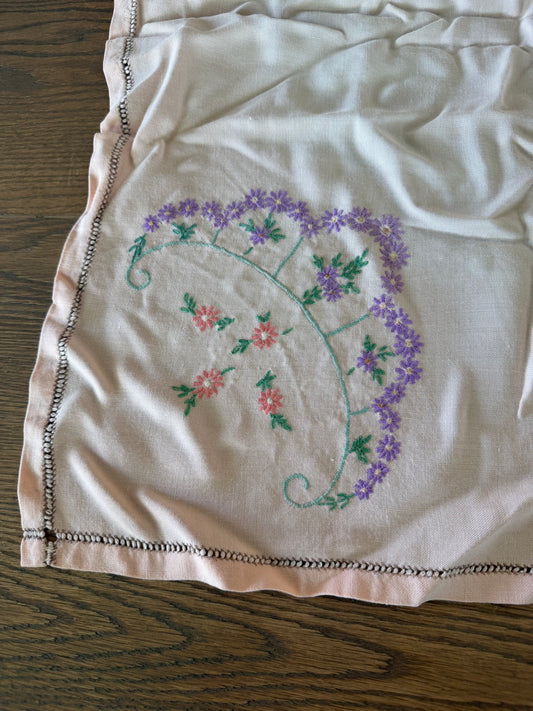 Peach vintage hand-embroidered cotton table topper