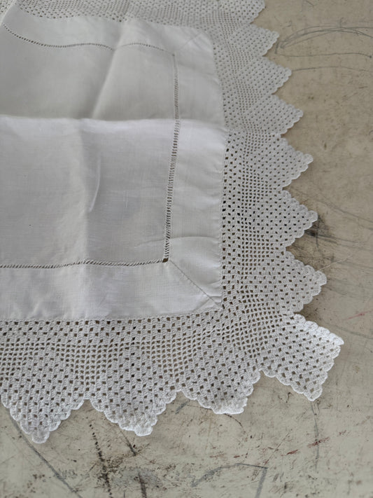 Vintage white linen table runner featuring hand-crocheted lace borders.