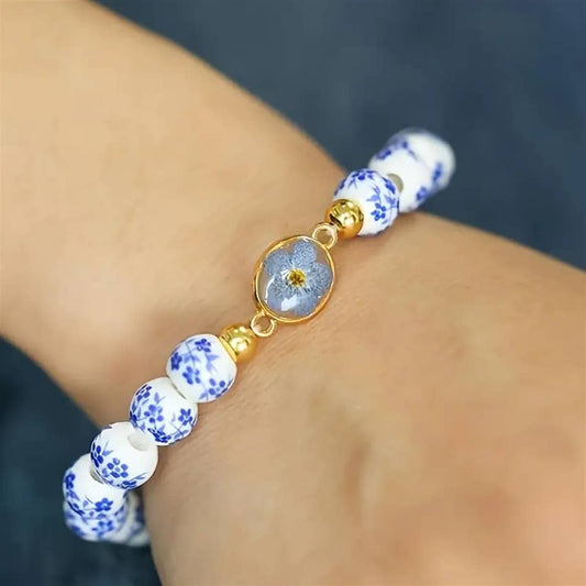 Boho Blue White Floral Pressed Flower Beaded Bracelet