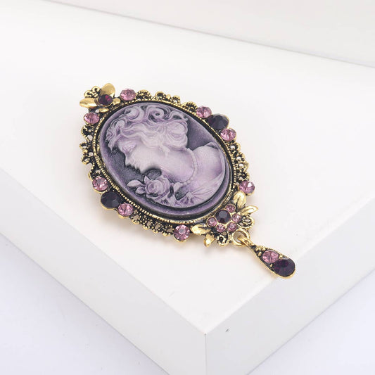Vintage Cameo Brooch, Rhinestone Accent Drop Pendant Pin