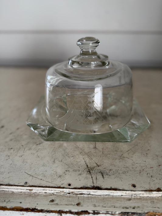 vintage glass dish with a domed lid, featuring a nautical clipper ship etched design