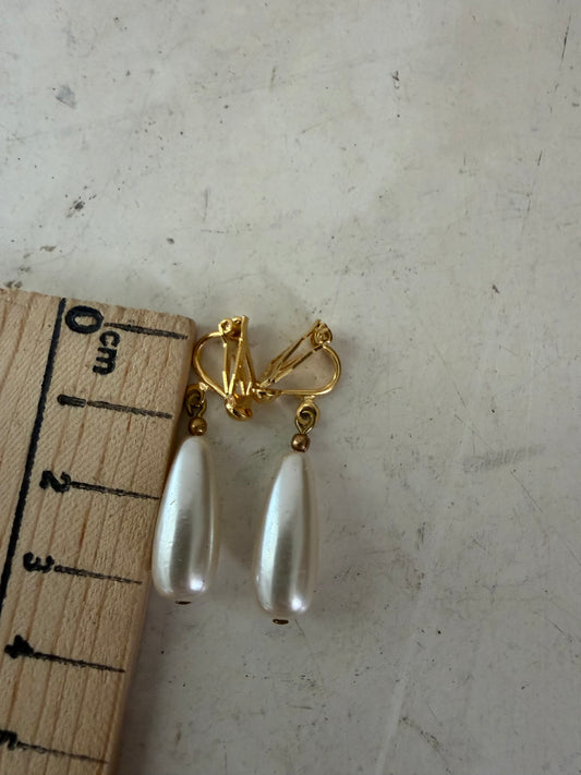 Shiny Metal Golden Colored Teardrop Faux/Fake/Imitation Pearl clip On Earrings