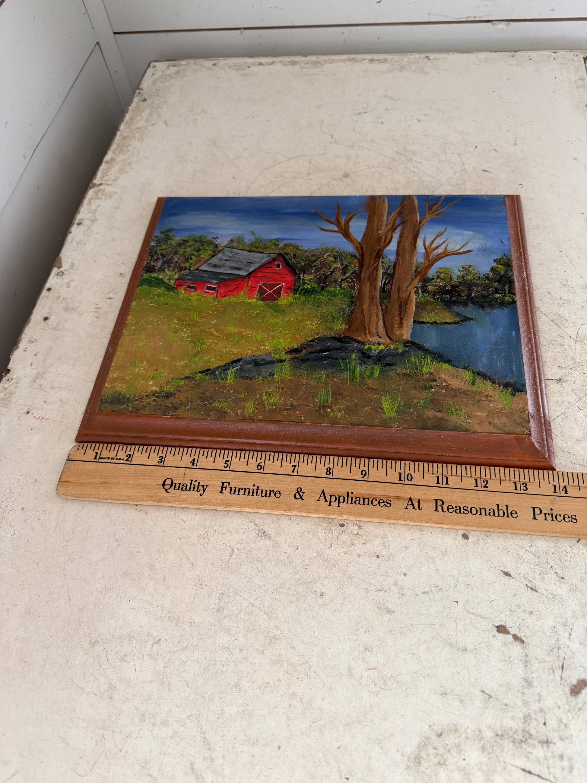 14” Original Folk Art Painting of Red Barn With Trees on Routered Wood