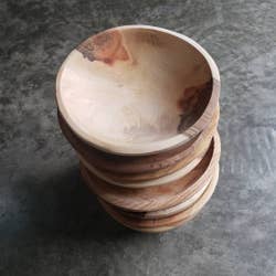 These small wooden plates are versatile and sturdy. This lovely little plate works well as a side piece on your tabletop, for salads or bread, or is perfect as a kids plate-- replacing plastic as a sturdy non breakable piece. Hand carved in the Blue Ridge mountains of Virginia, by 89 year old Glendon Boyd, a 5th generation Appalachian woodworker, using traditional techniques and local woods such as maple, oak, cherry and occasionally black walnut. Plates are signed and dated and the type of wood is carved in the bottom. Treated with vegetable oil only. Sizes vary; approx. 7" dia. for the small and 9" for the large