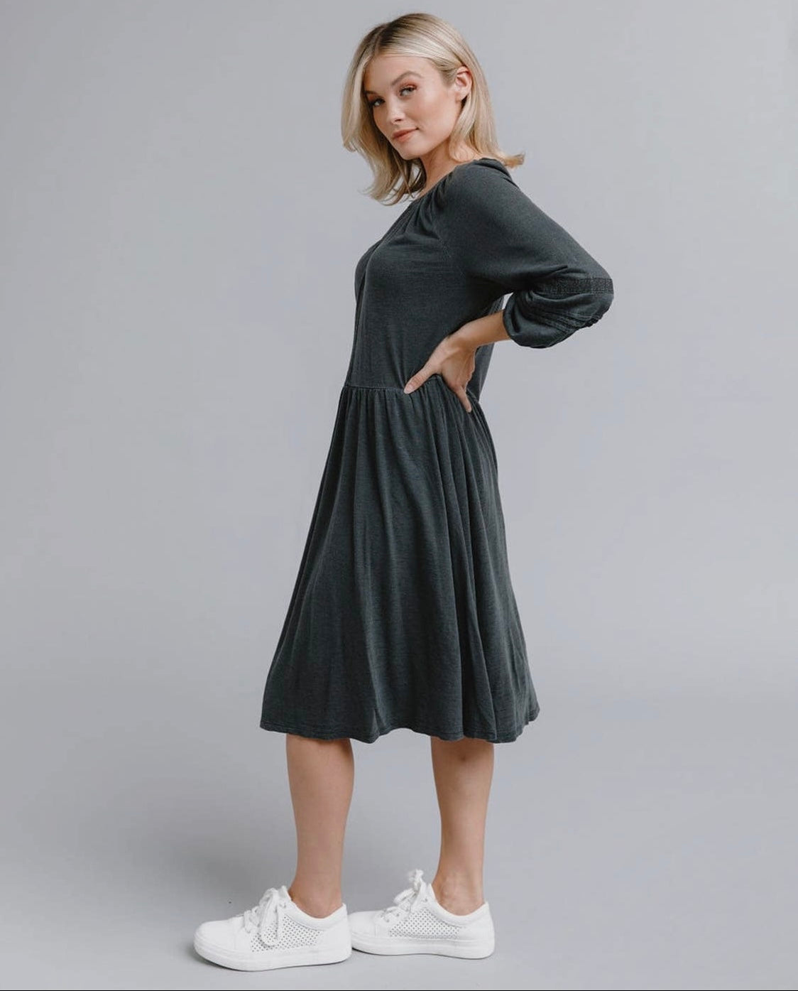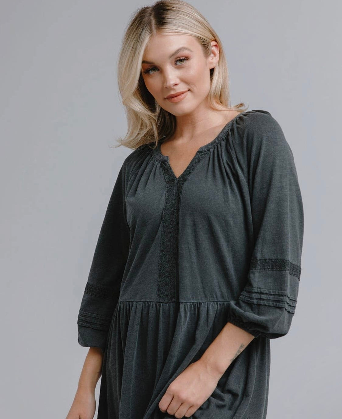 * V-neck * Long sleeve * Lace detail on sleeve and bodice * Knee-length, flared * Relaxed fit * Body: 58% cotton, 42% modal, Lace: 100% cotton * Length of size M: 39.25” (length varies slightly by size) * Care instructions: Machine wash cold with like colors, non-chlorine bleach if needed, lay flat to dry, warm iron * Import * Model is 5’8” and wears size XS