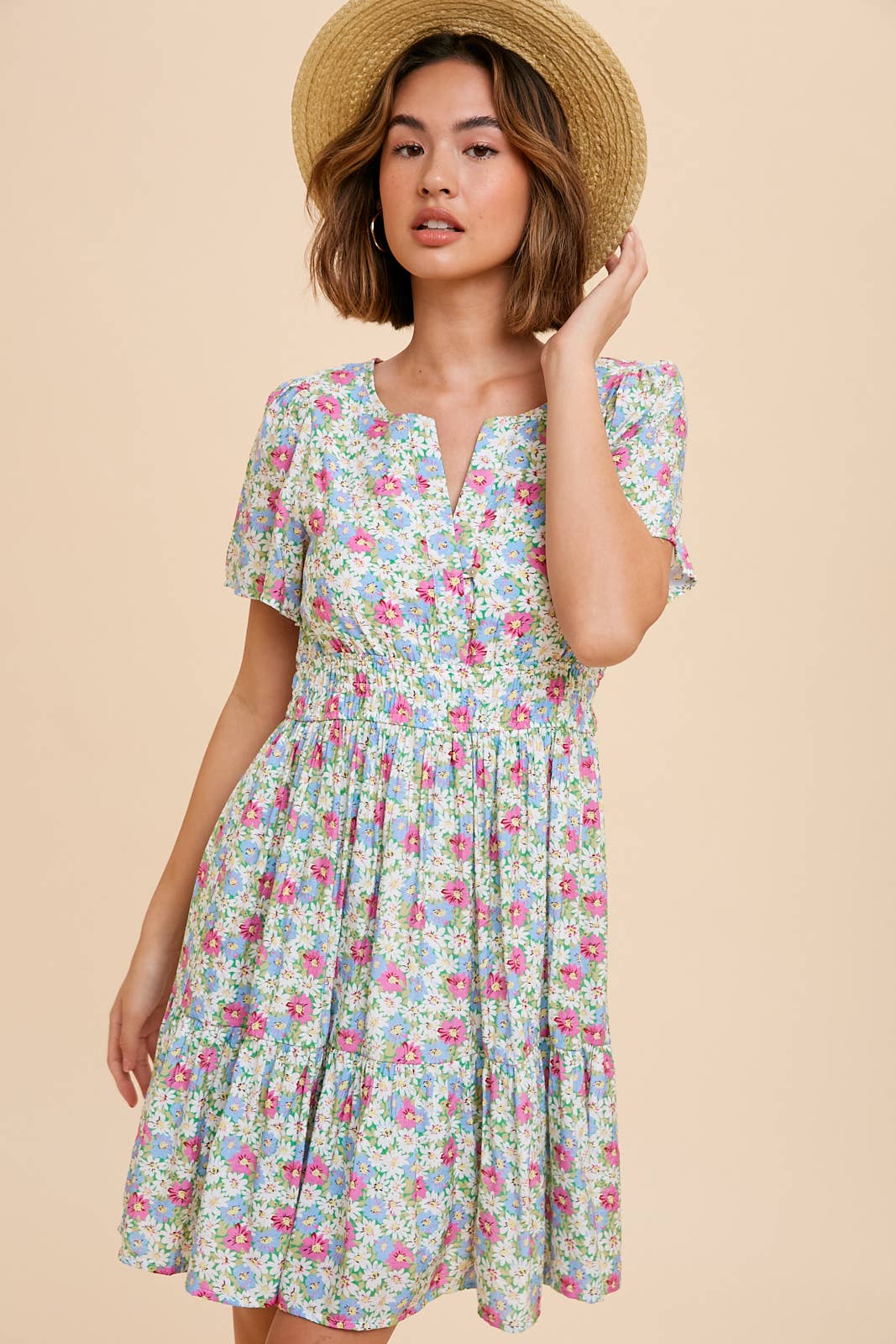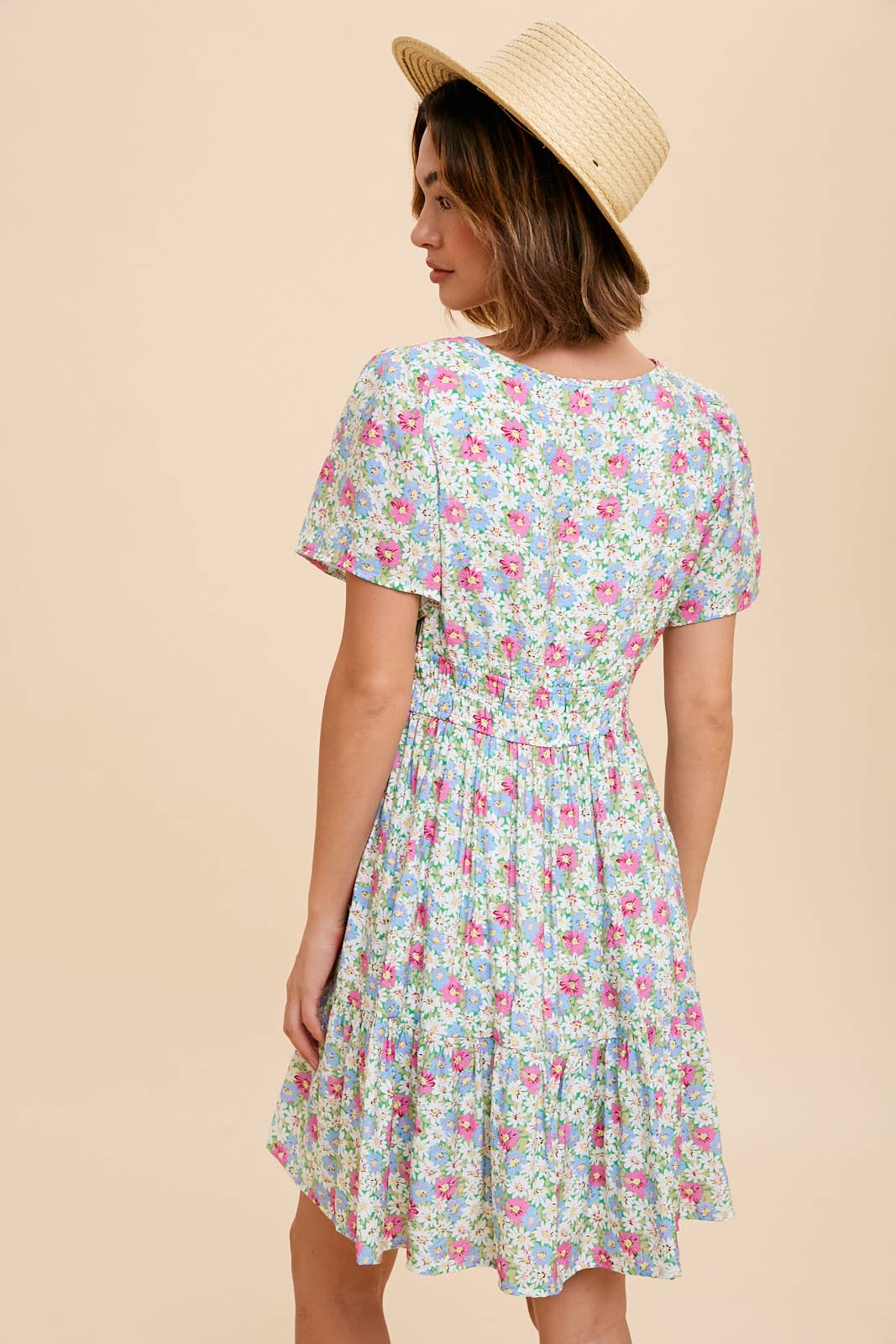 FLORAL V NECK MINI DRESS FEATURES SMOCKED WAIST, FULL LINING, FLUTTER SLEEVES AND FUNCTIONAL SHELL BUTTON FRONT WITH LOOP BUTTON HOLES.