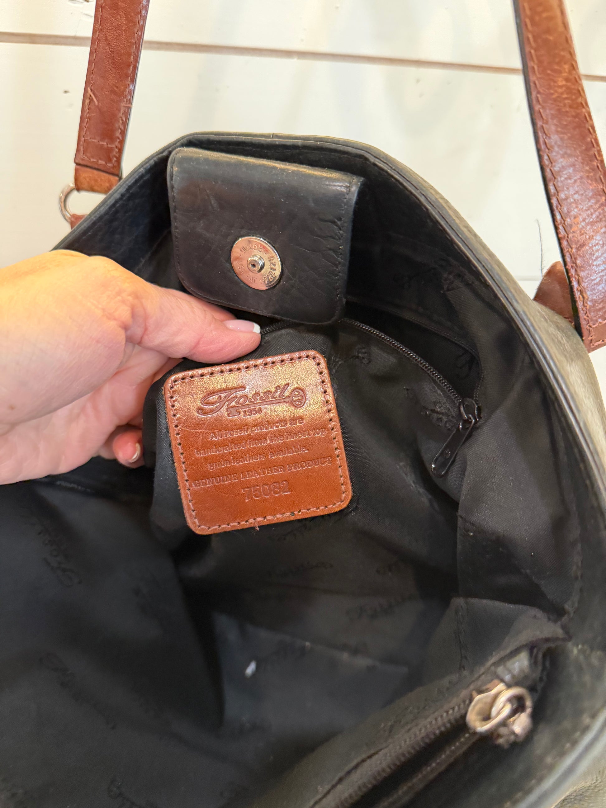 Fossil Dark Green Leather Handbag W/ Rich Brown Handles & Decorative Stitching
