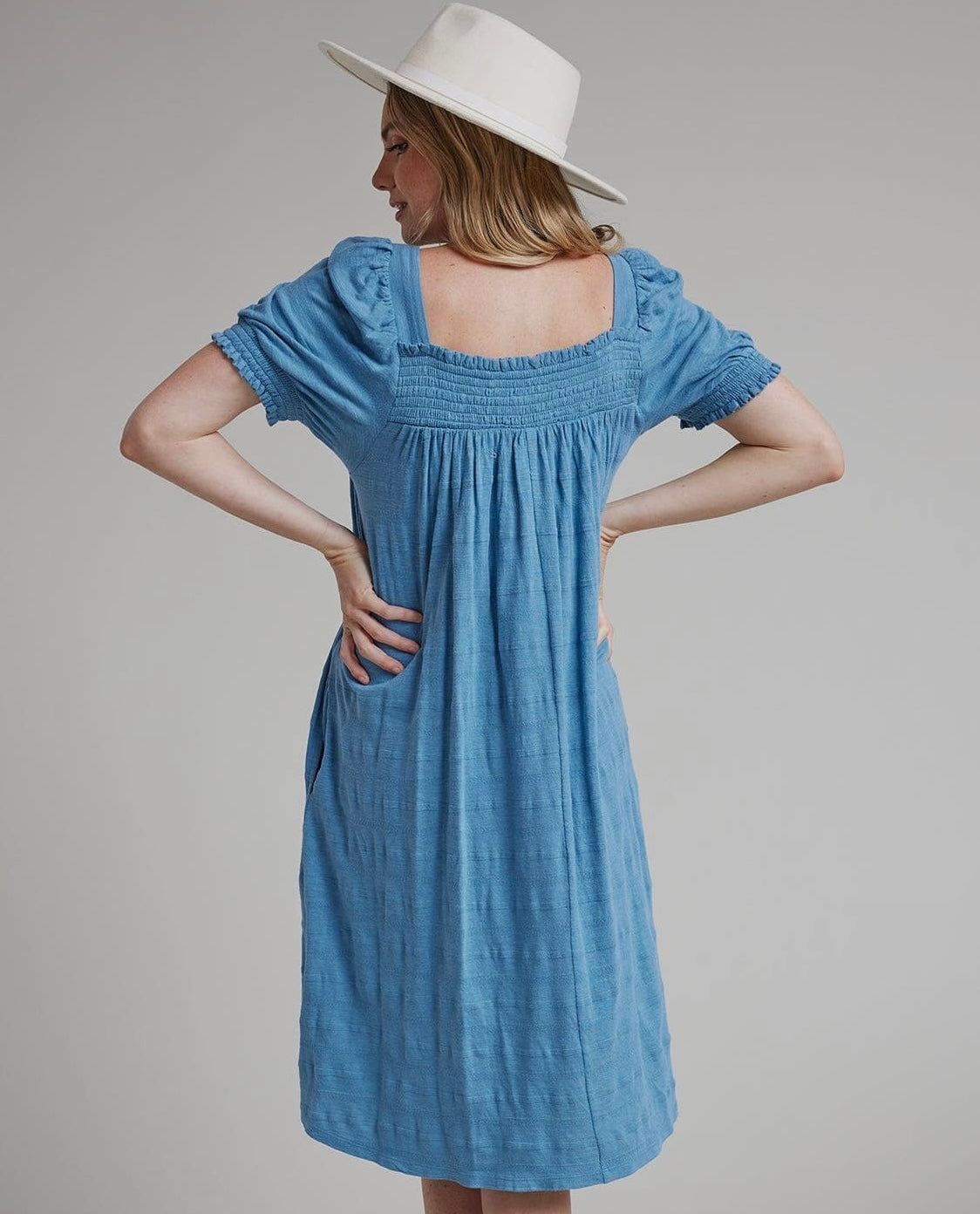 * Square, smocked neck * Short sleeves with smocked hem * Embroidered front detail * Side pockets * Textured fabric * Knee-length * Relaxed fit * 60% cotton, 40% modal * Care instructions: Machine wash cold with like colors, non-chlorine bleach if needed, lay flat to dry, warm iron * Import * Model is 5’8” and wears size XS