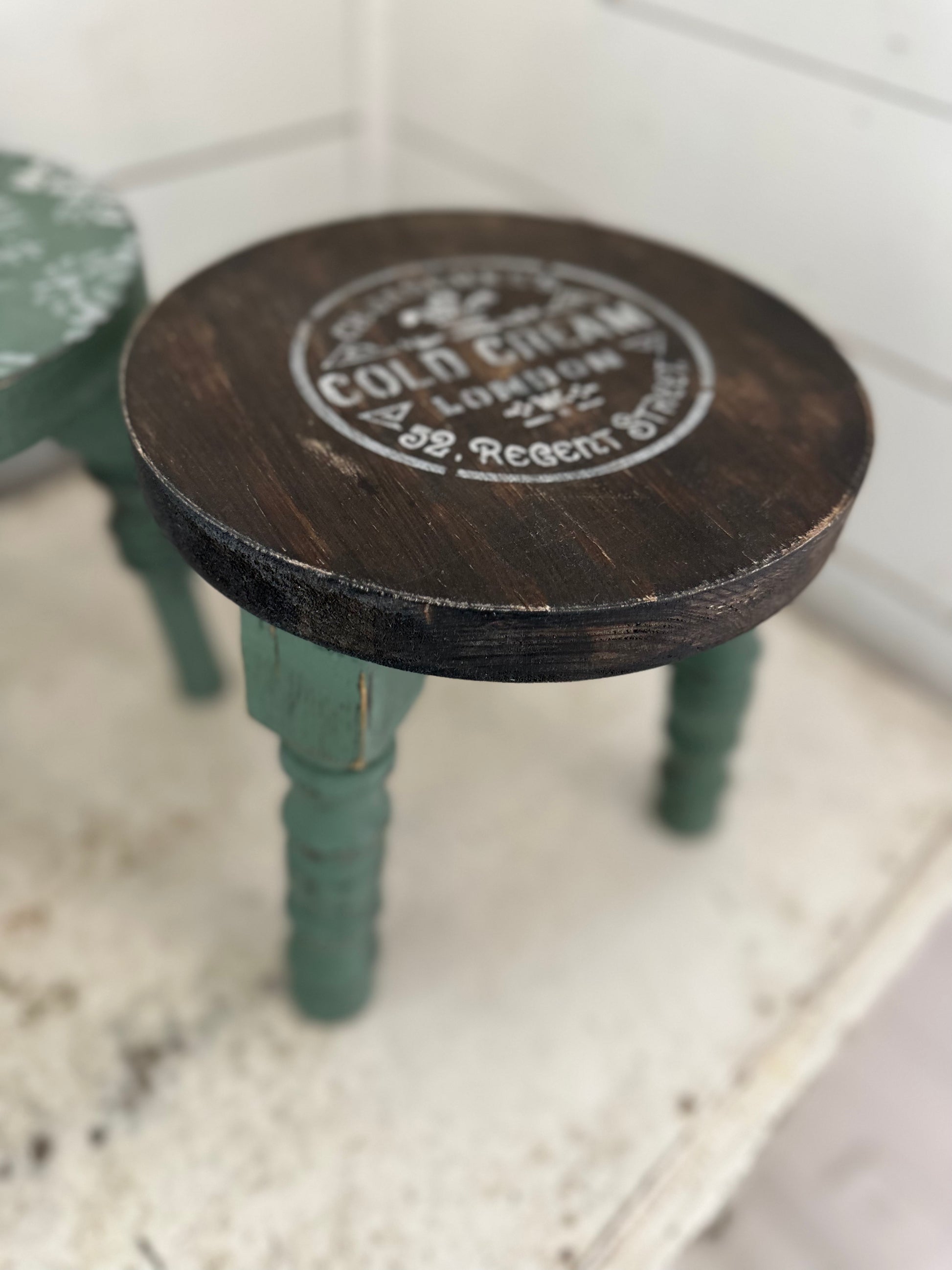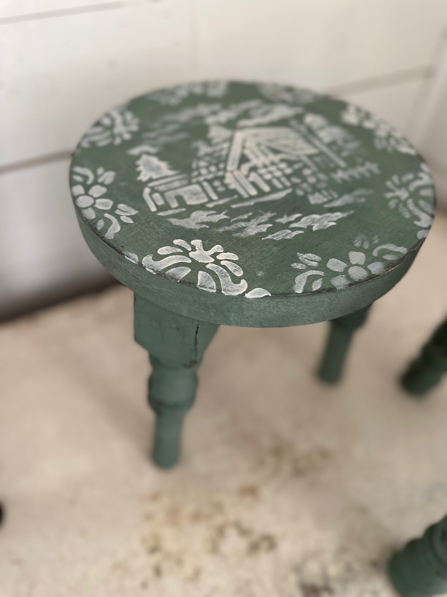 Reminiscent of an old dairy farm milking stool, this reproduction piece is made of solid wood and hand painted and stenciled.