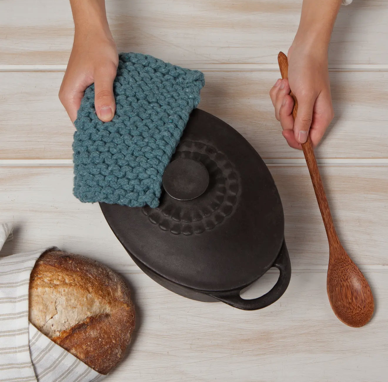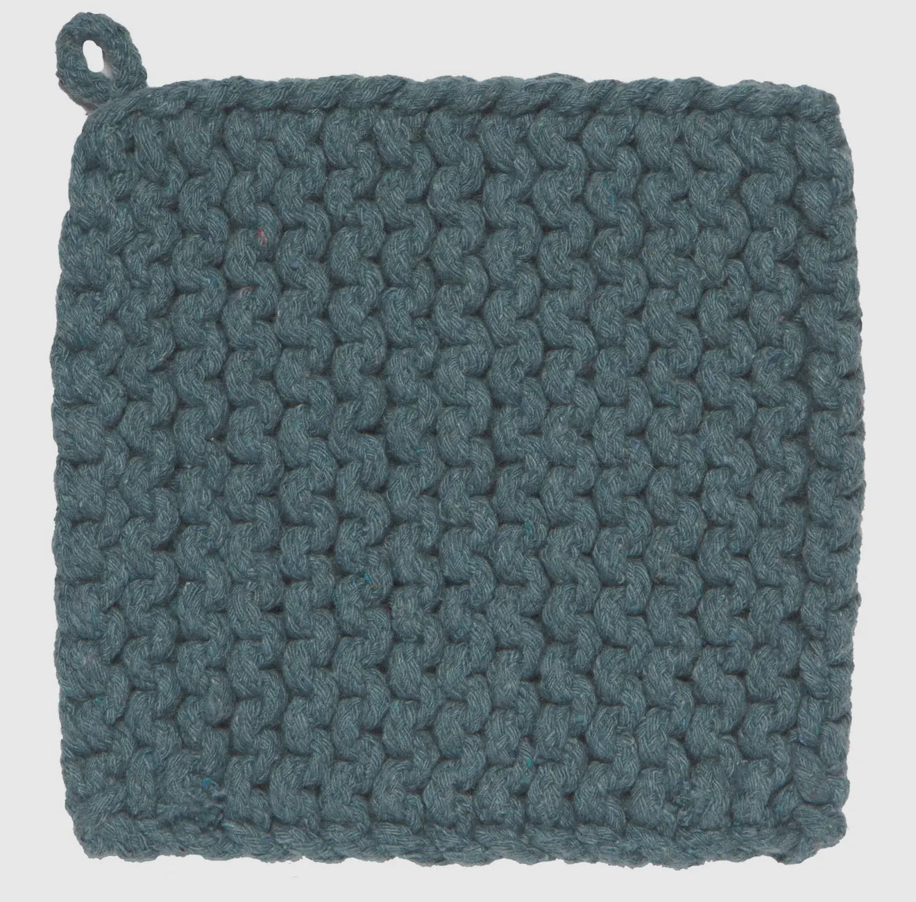 This textured potholder is made by hand in an array of appealing yarn colors. It does double duty as a trivet and adds tactile interest by the oven or on the table. Part of the Medley collection of color-coordinated kitchen and table linens from Danica Heirloom.