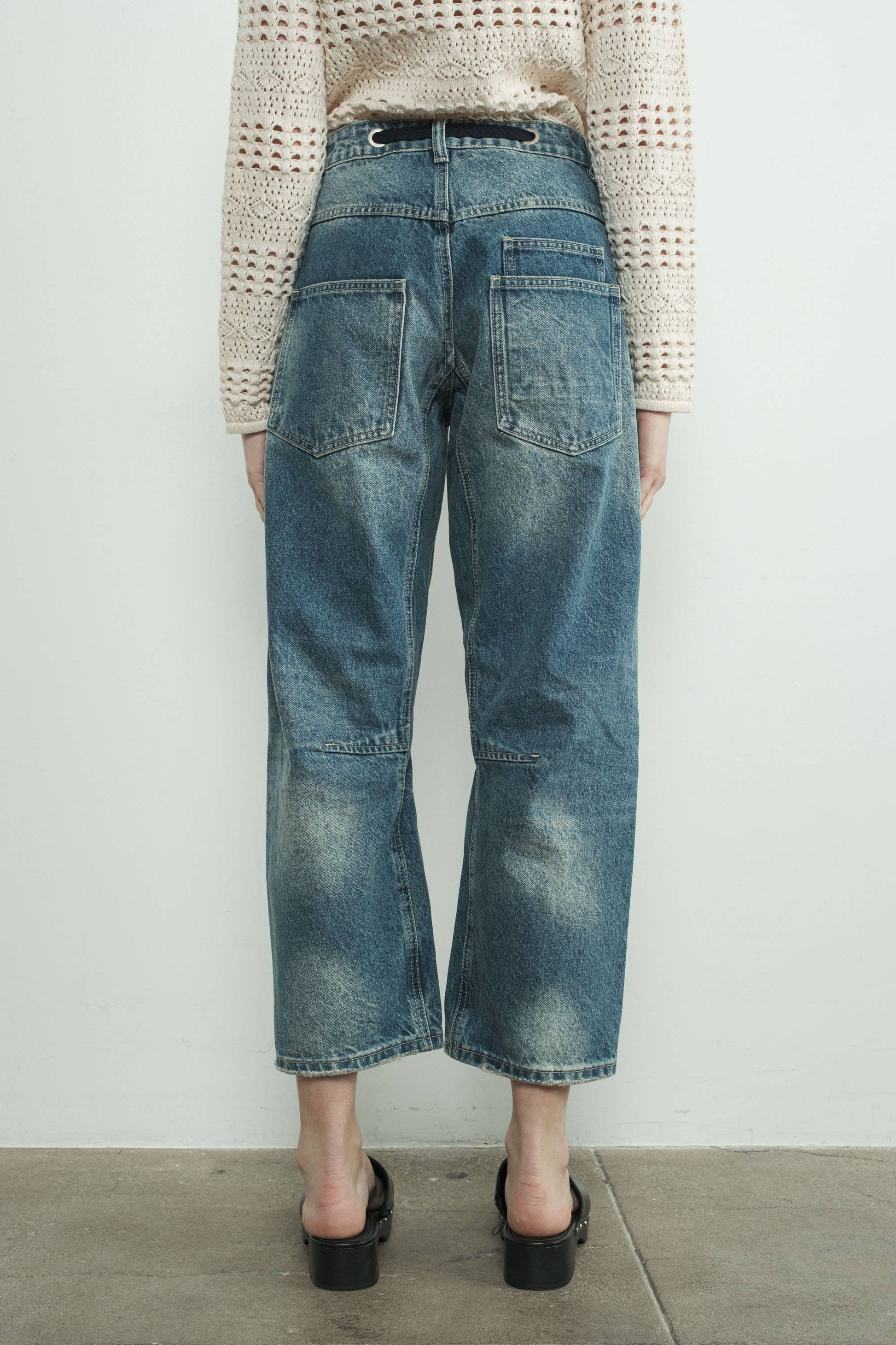 BARREL DENIM PANTS WITH EYELET WAIST: MEDIUM WASH