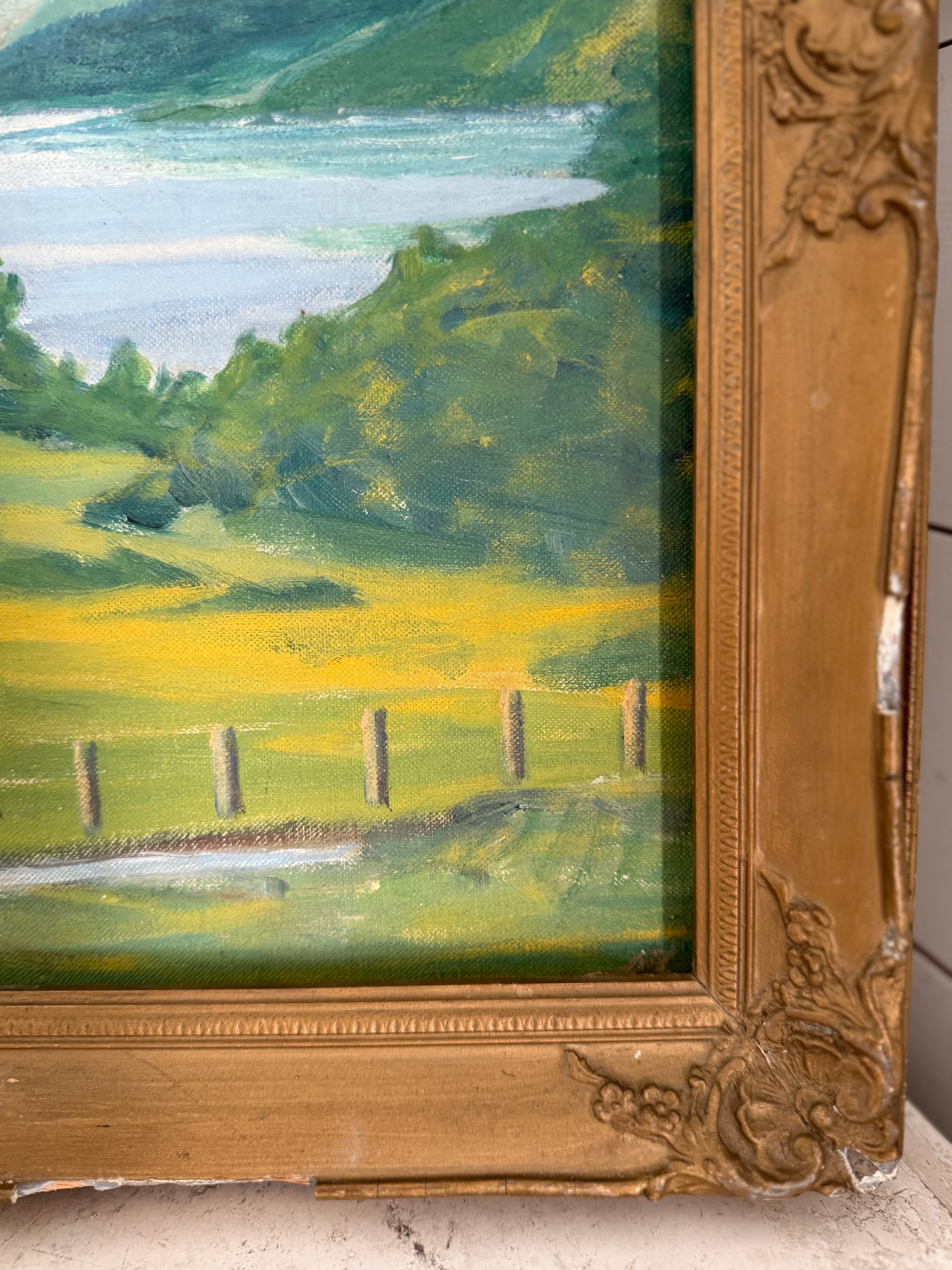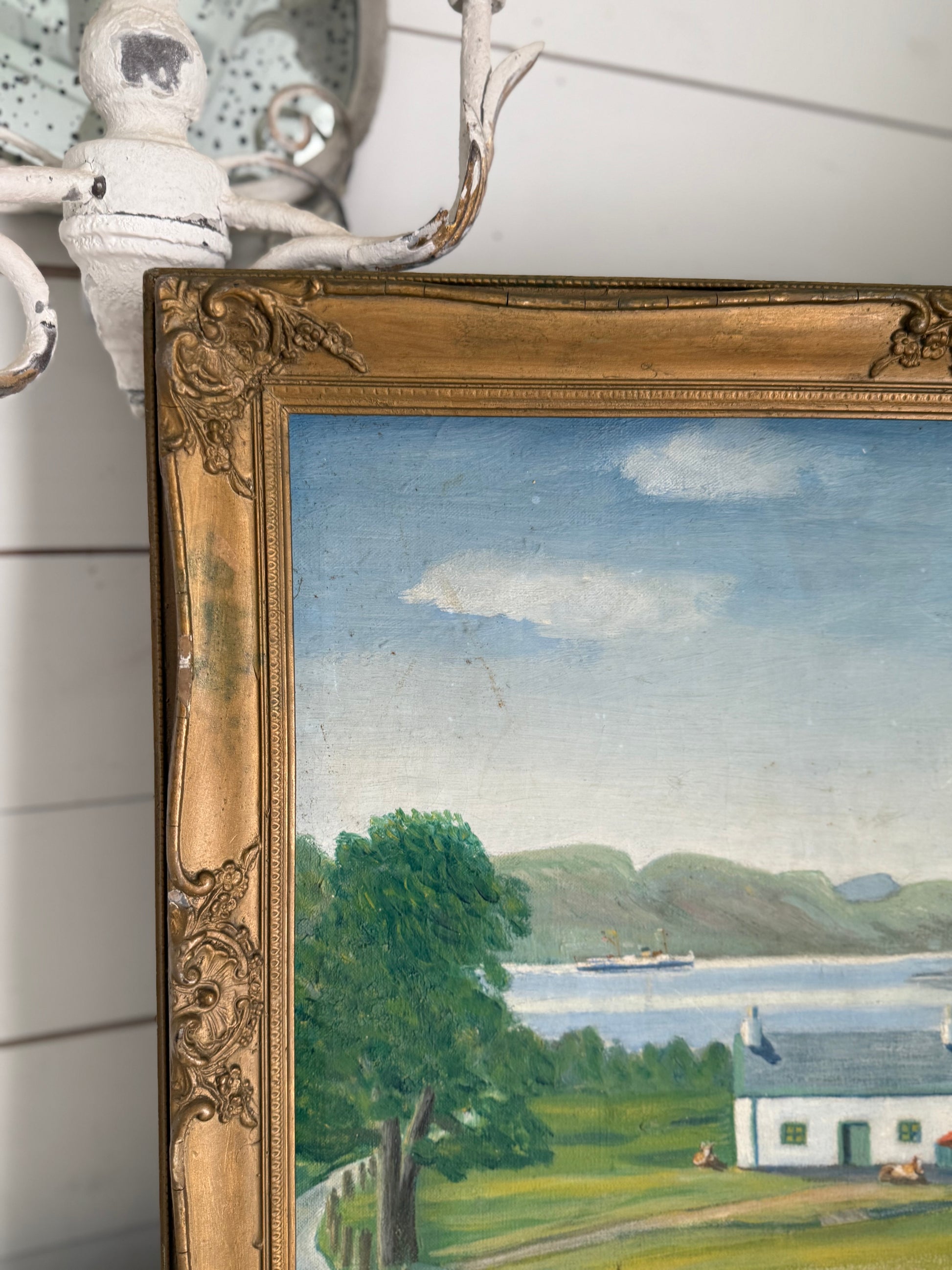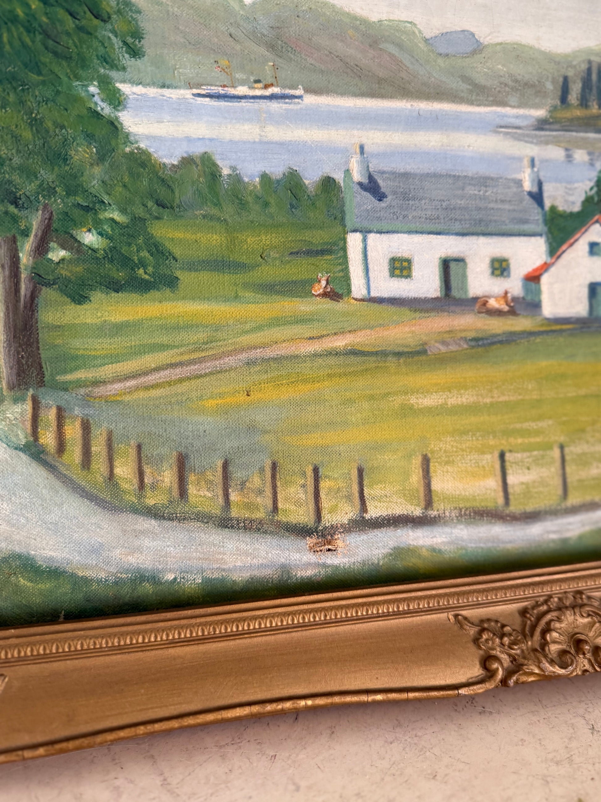 Original English Cottage & Lake Antique Art with Frame - as is see damage as shown
