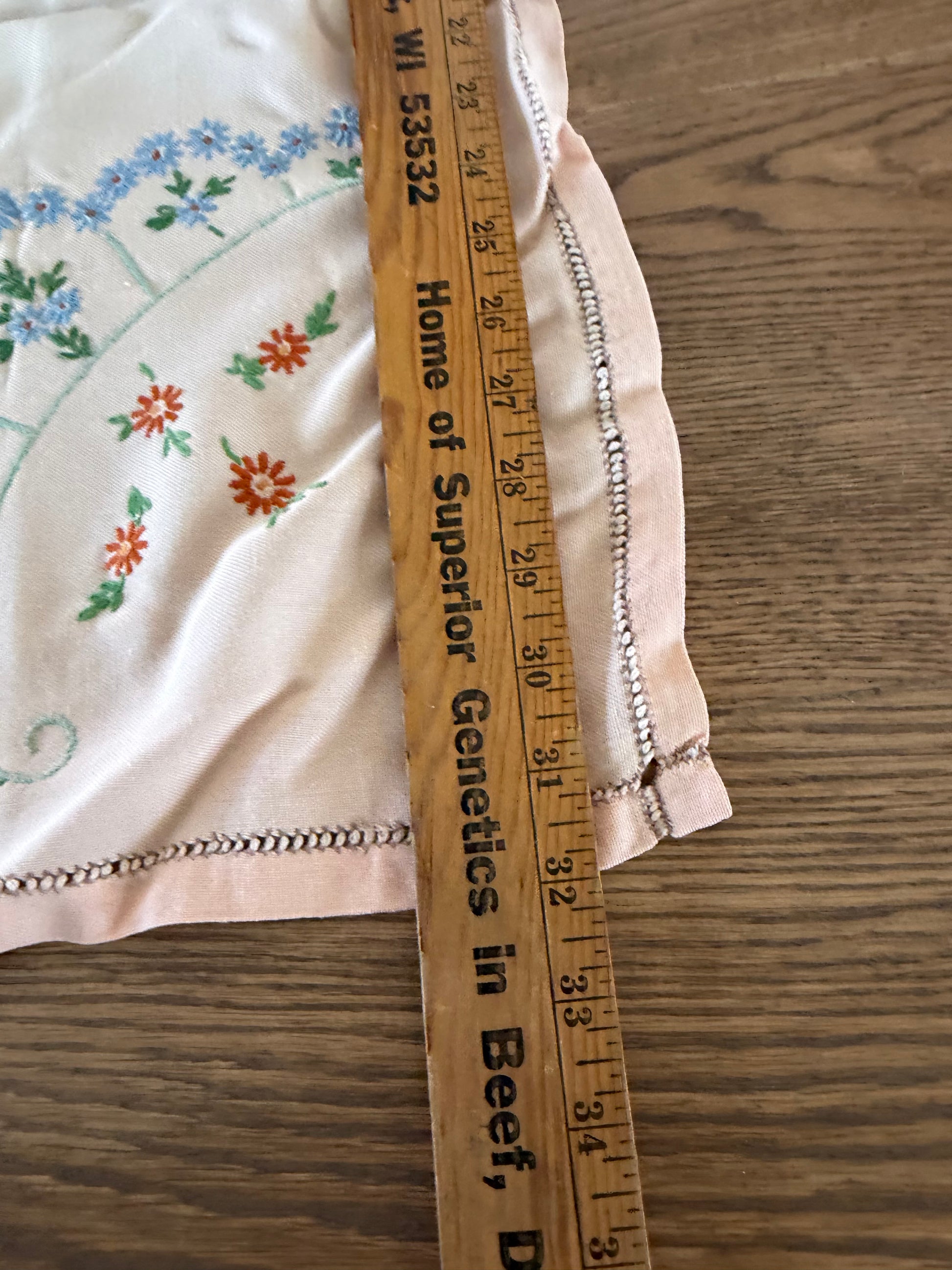 Peach vintage hand-embroidered cotton table topper