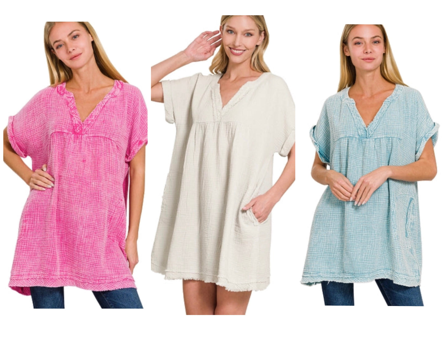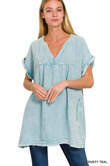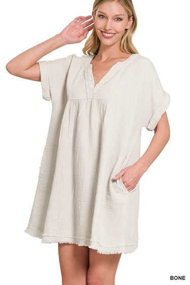 Washed Double Gauze Raw Edge V Neck Dress 100% COTTON