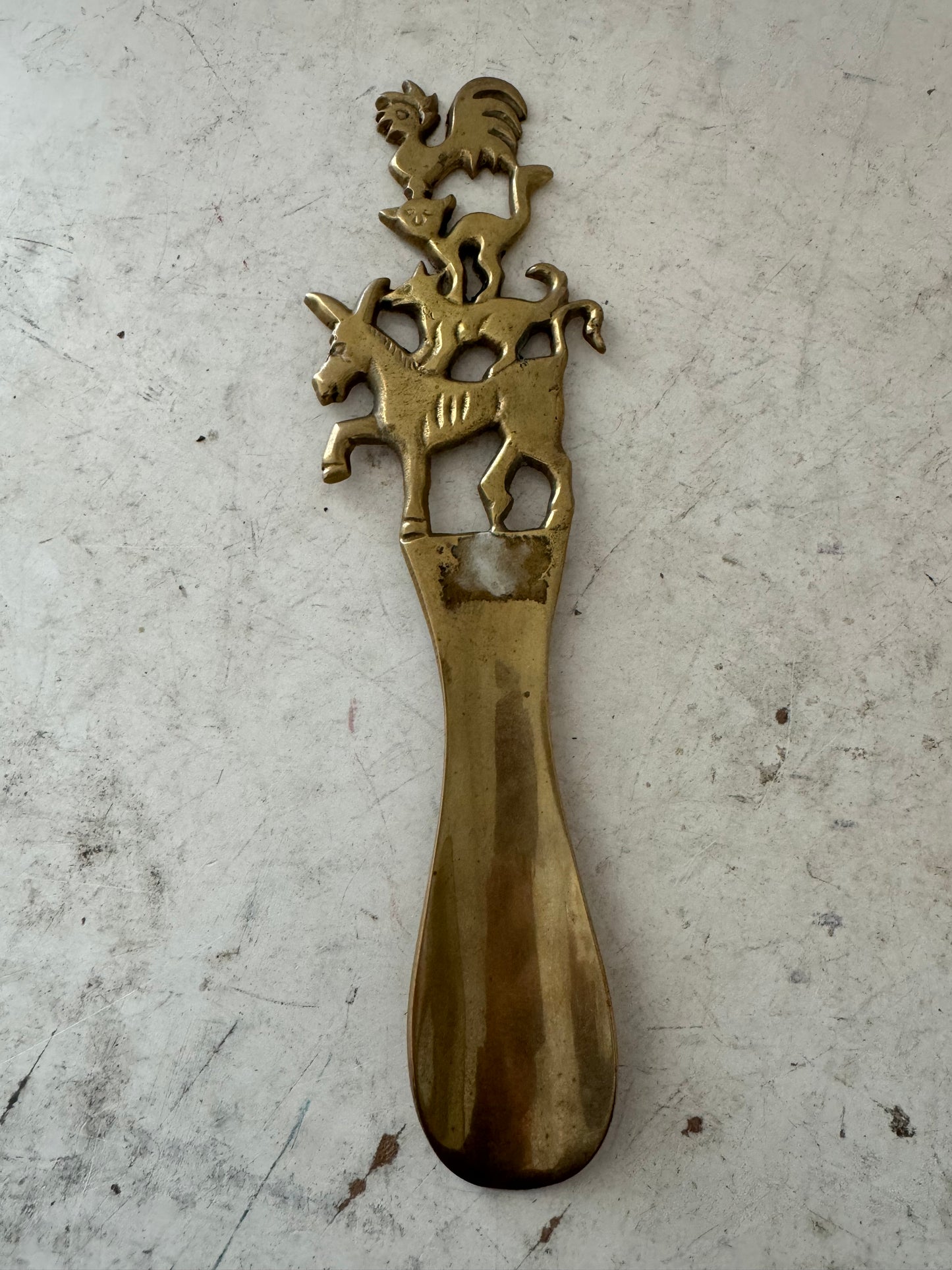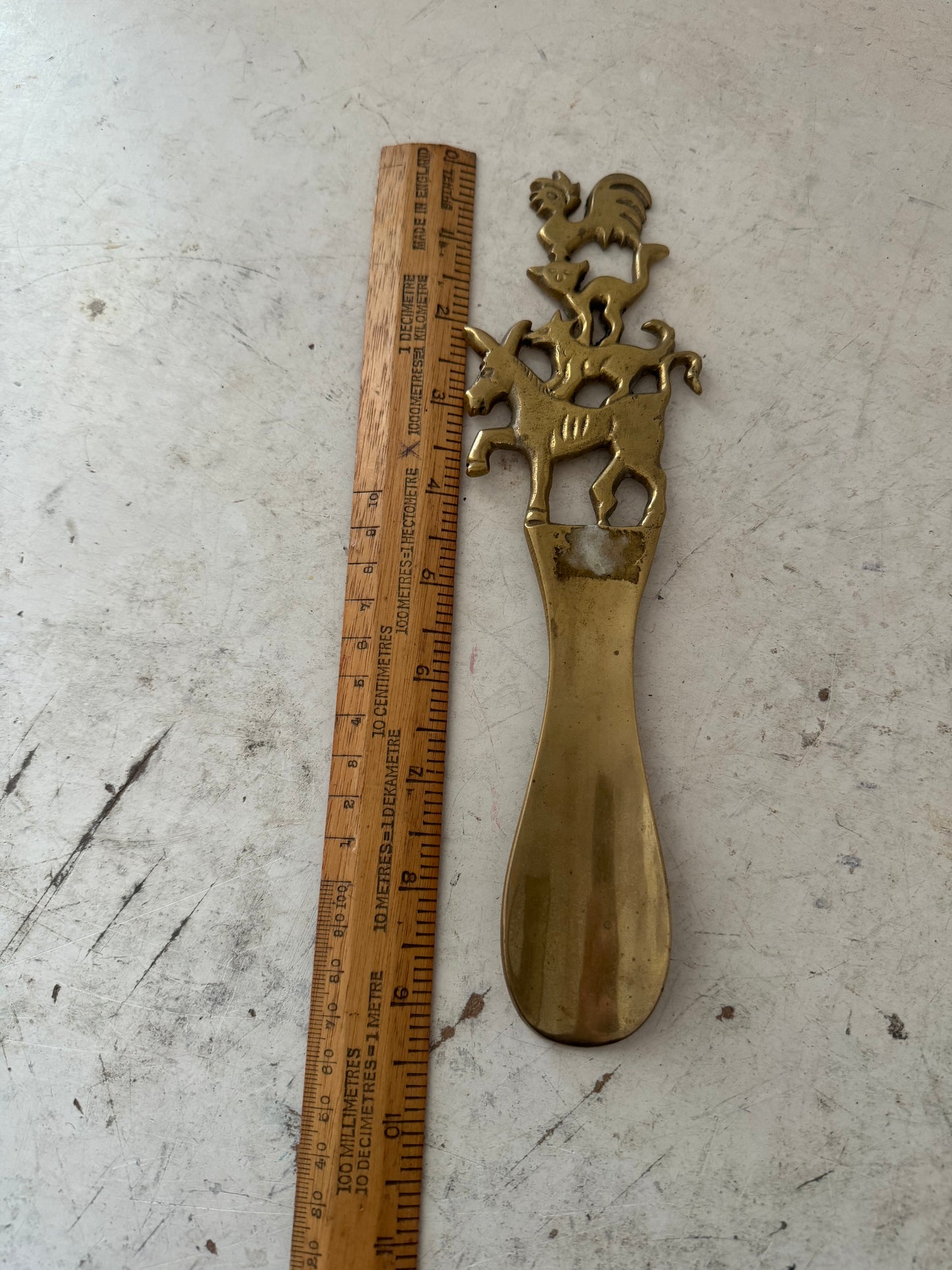 Vintage Brass Shoehorn With Stacked Animal Handle