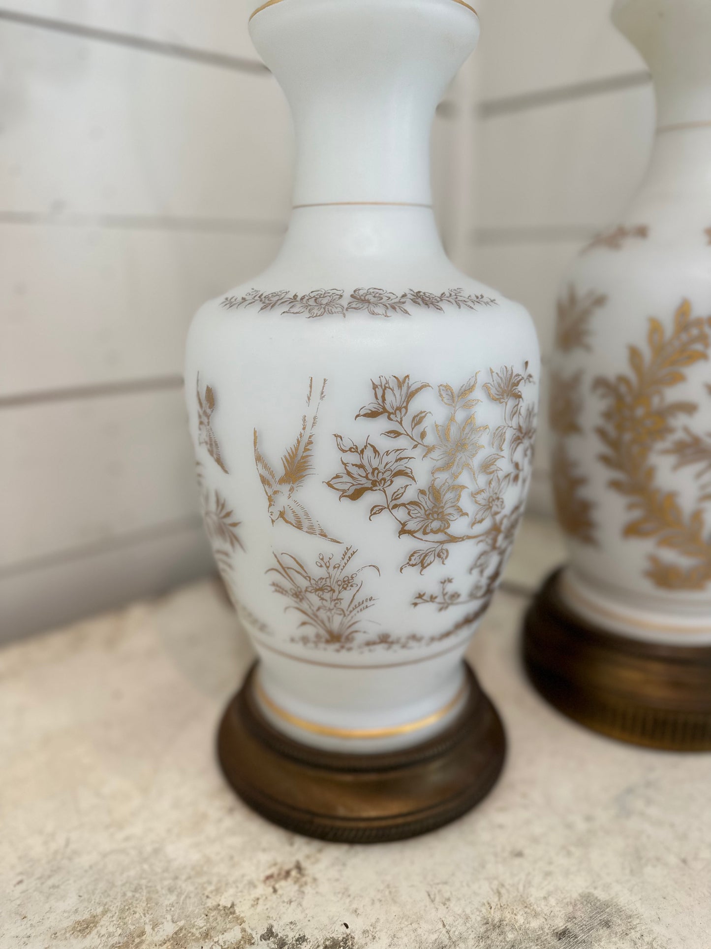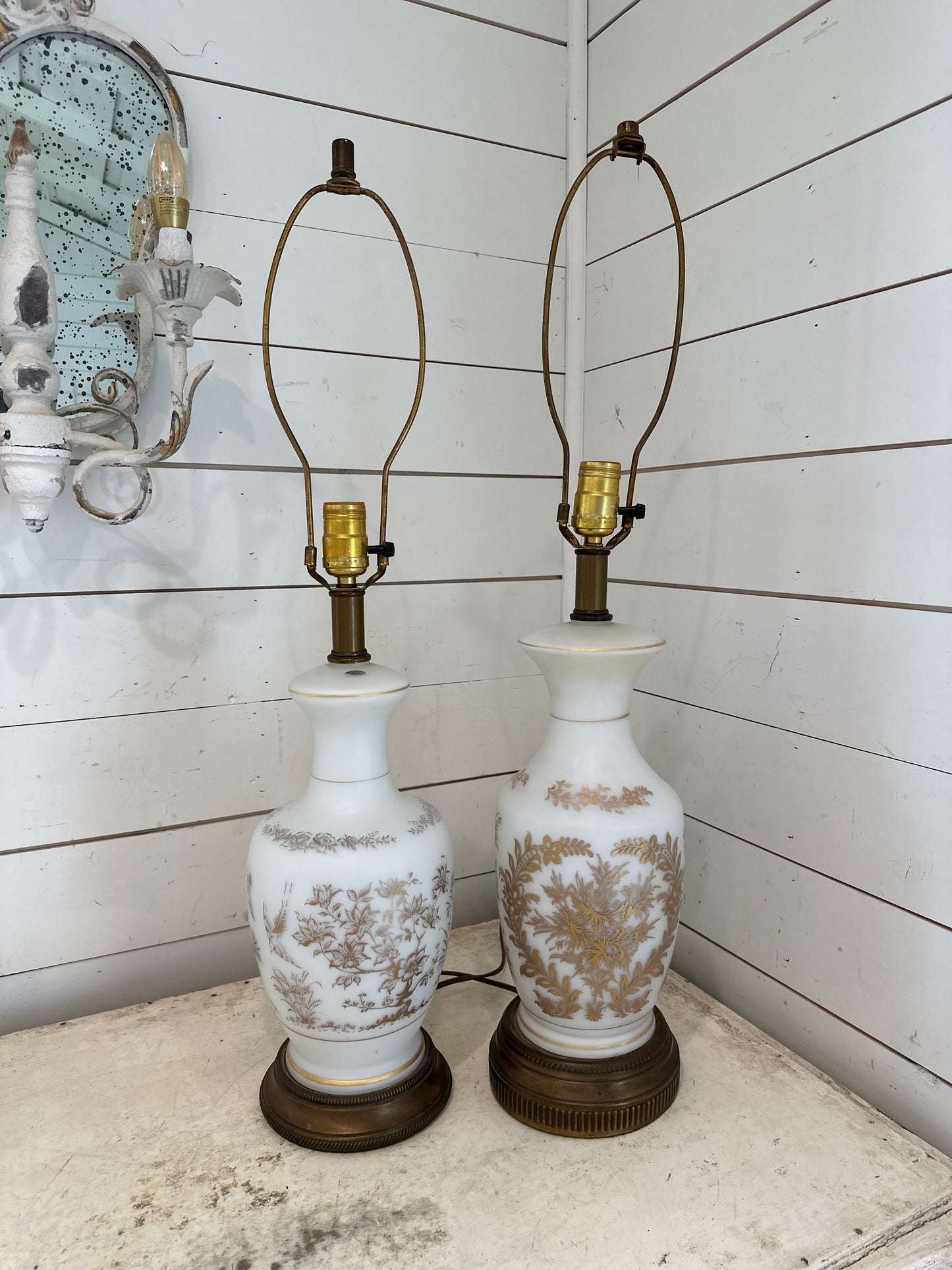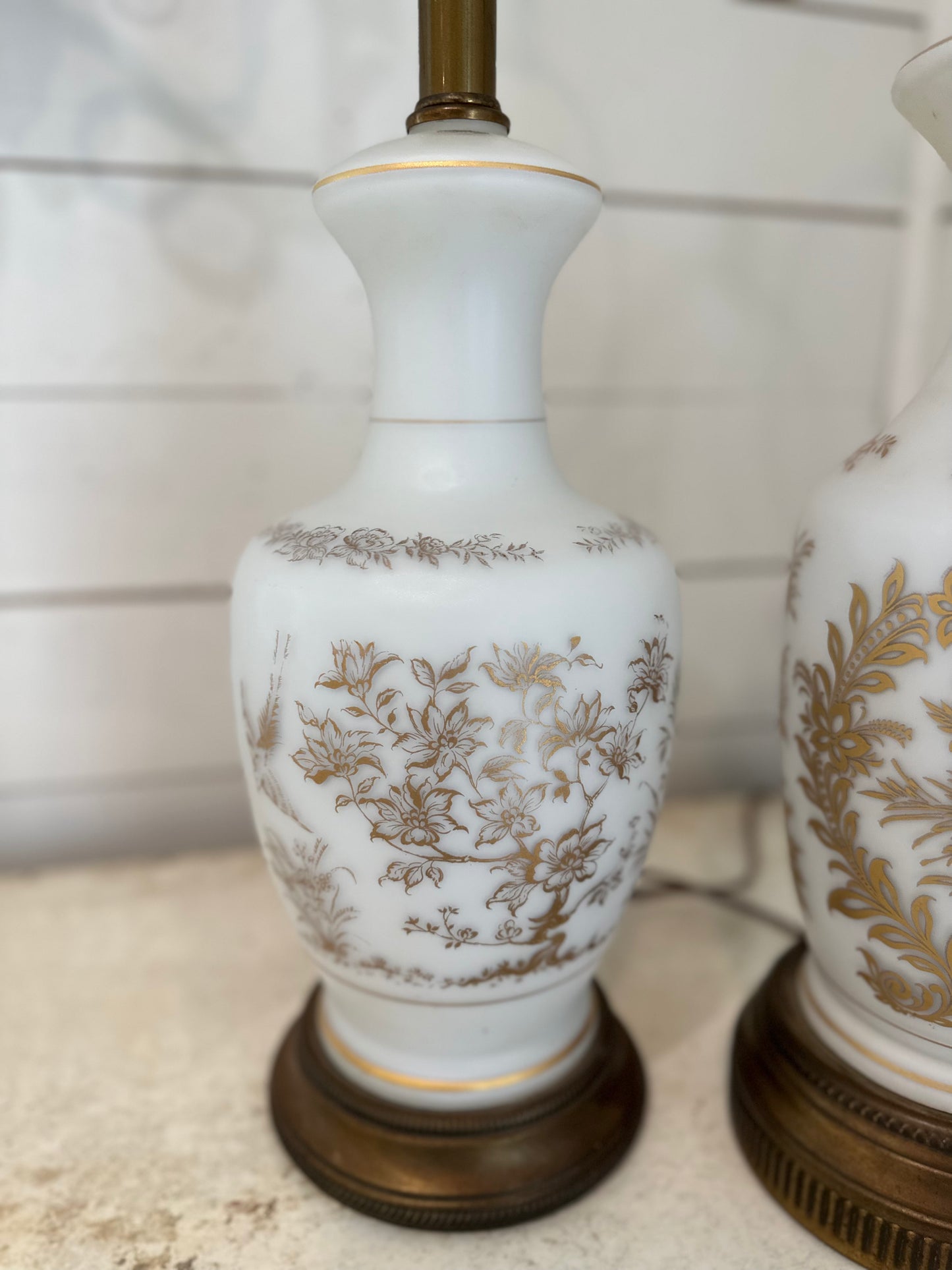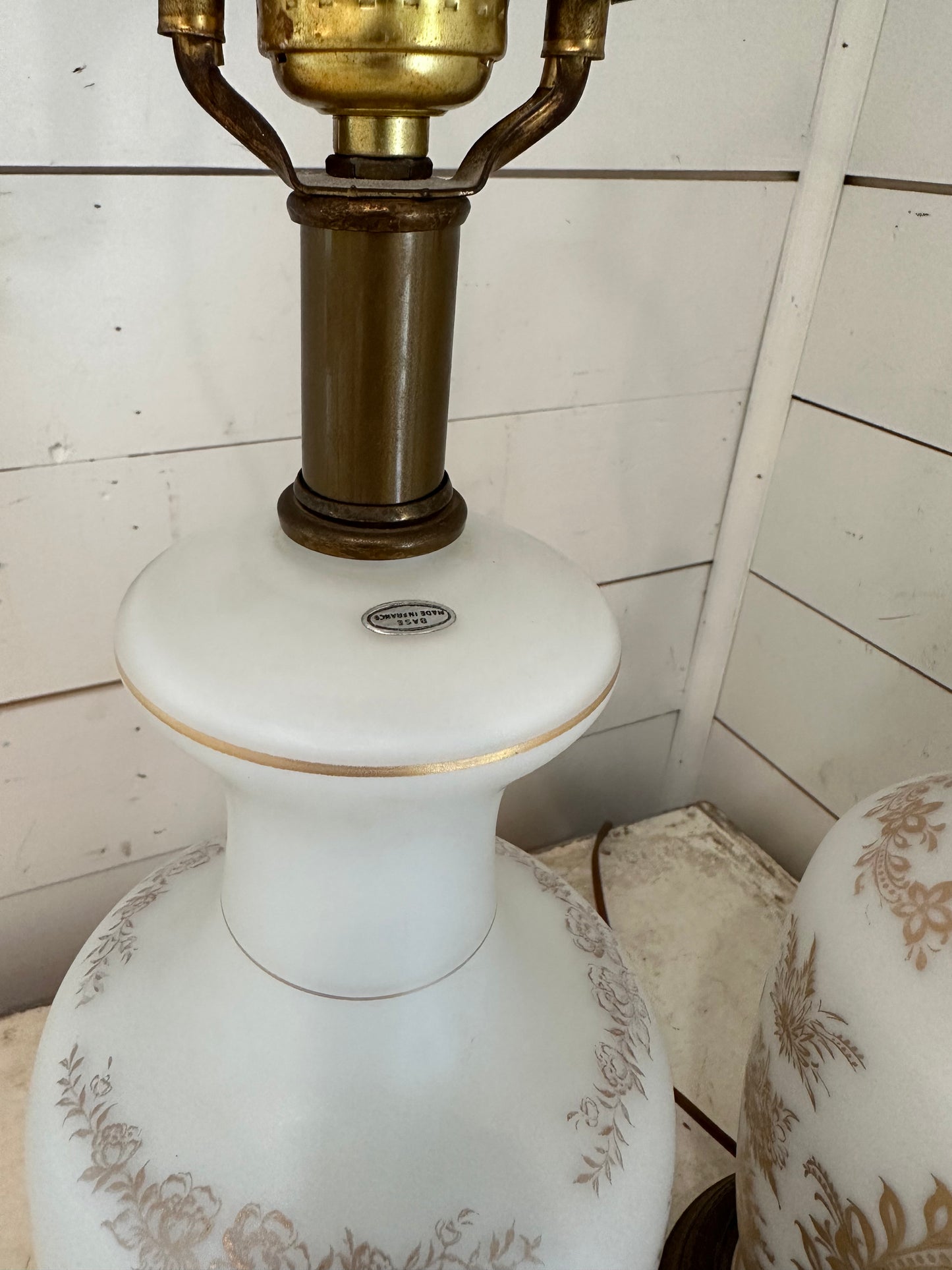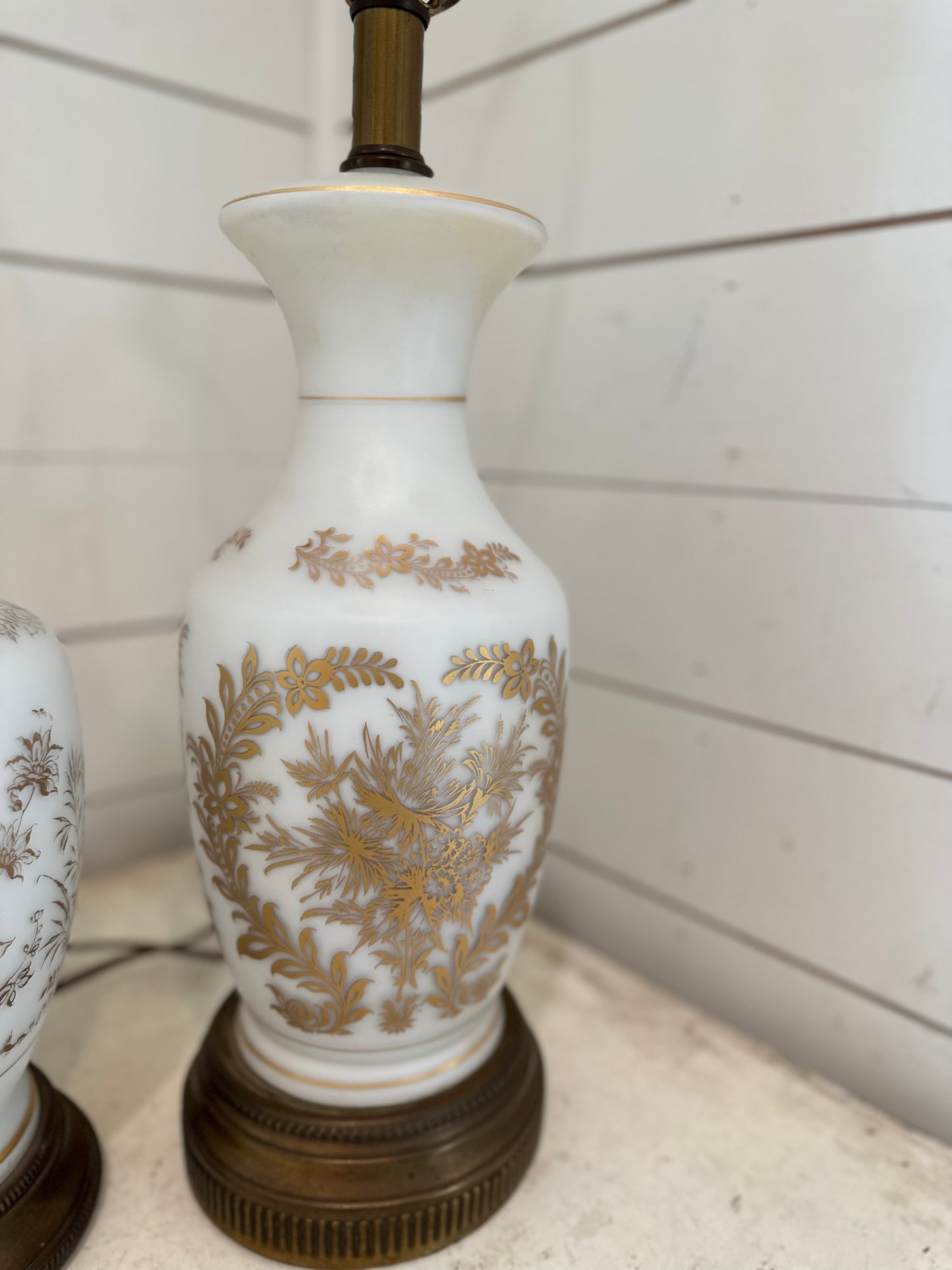 Vintage French Bristol Glass White/Gold Decorated Table Lamps brass base - a Pair