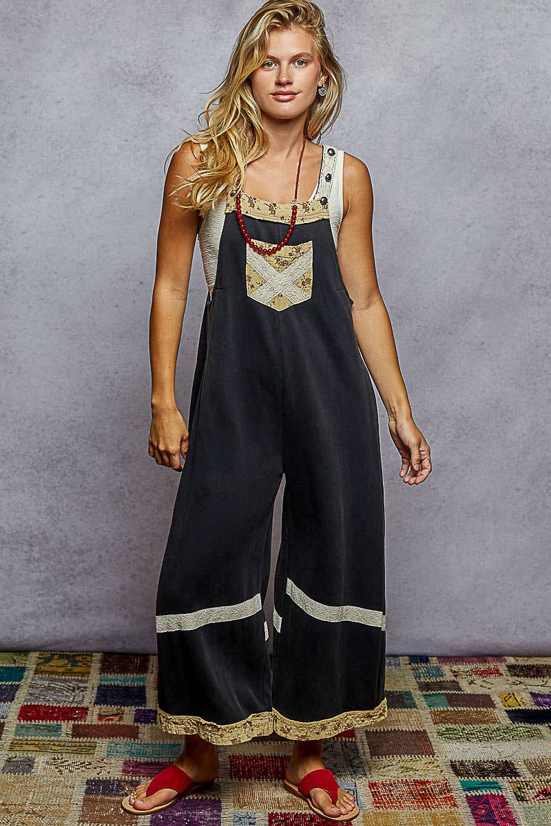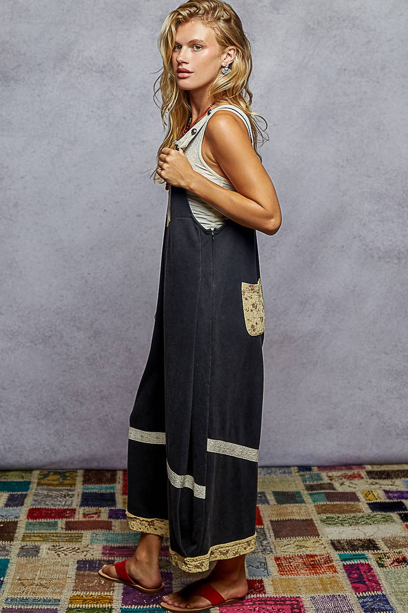 Vintage washing print patch solid French terry knit overalls