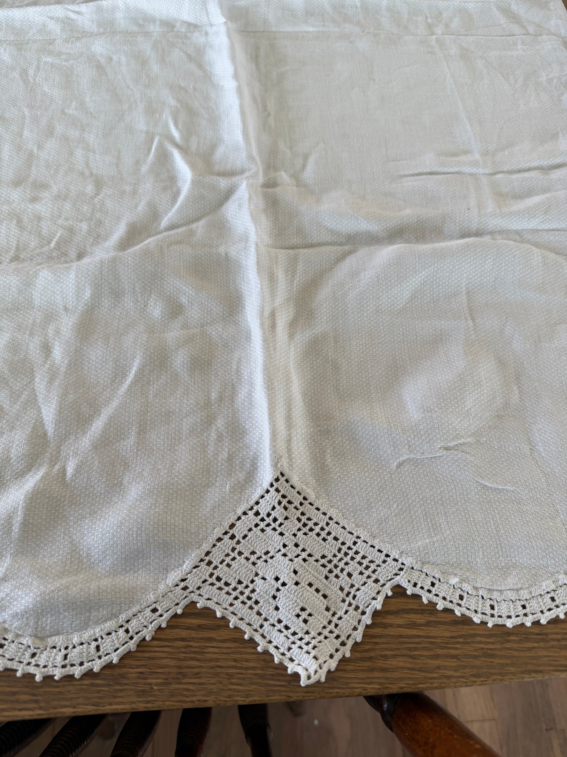 Vintage white linen table runner featuring hand-crocheted lace borders.